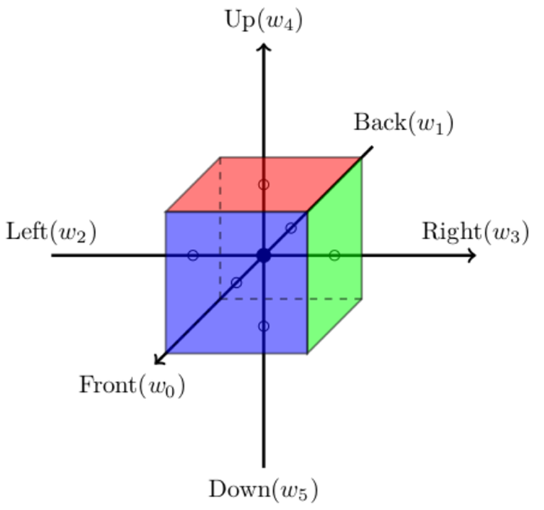 初始时,骰子各面的数字分别为 $w_0, w_1, w_2, w_3, w_4, w_5$,分别对应前、后、左、右、上、下。