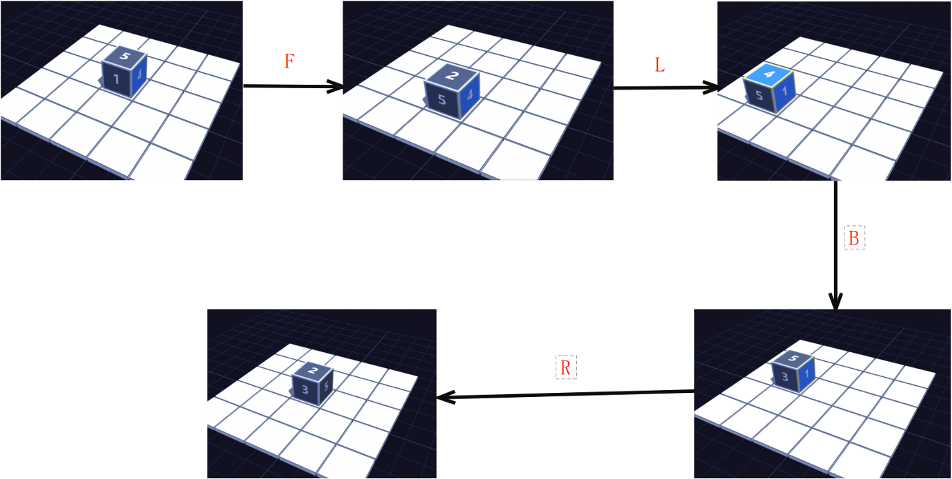随后,骰子将进行 $n$ 次滚动,每次滚动方向为 $F,B,L,R$ 之一,分别表示: