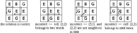 Some word W (let us consider its length being k) is found on the grid if you can find such sequence of cells (x1, y1), (x2, y2), ..., (xk, yk) that: