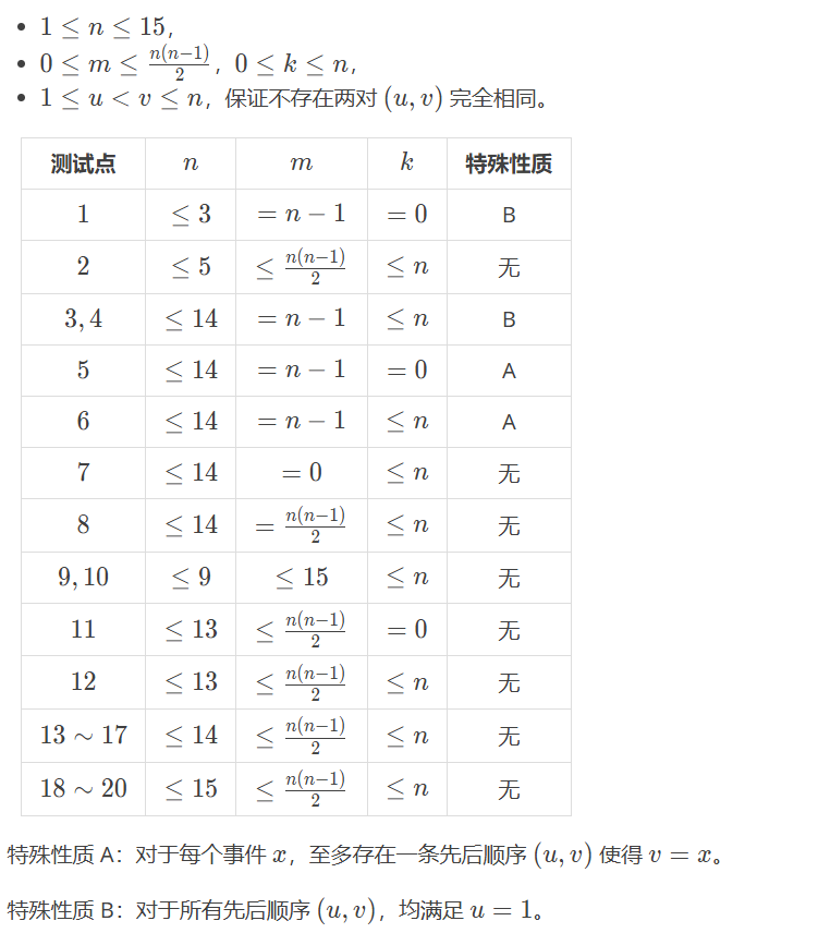 为了拯救这条即将毁灭的时间线,小 T 决定把这 $(k + 1)$ 段序列按某种顺序重新拼接成一个长度为 $n$ 的排列,形成一条新的时间线。不过,由于事件之间存在一定的逻辑关系,事件的发生时间之间也存在一些先后顺序要求。经研究,共存在 $m$ 条先后顺序要求 $(u, v)$,要求事件 $u$ 的发生时间必须在事件 $v$ 之前。也就是说,$u$ 在时间线中的出现位置必须在 $v$ 之前。