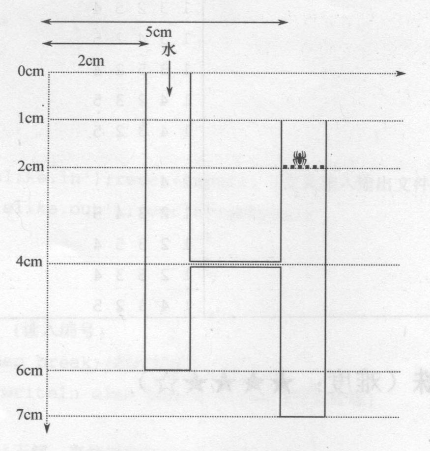 为了简化问题,题目假设水下降速度很快,从开口下降所用的时间忽略不计。蜘蛛所在的位置可以假定为描述深度稍微高一点点的地方。比如,蜘蛛处于图1.3.1左边管道深度为4的地方的时候,那么答案应当是5,而不是2。同时,如果水到达一个管道的出口的时候,水并不会立刻溢出。只有等所有跟其相连的管道低于该开口的空间都充满了水的时候,水才开始溢出。(不排除有小细管处于开口的垂直位置的情况。)