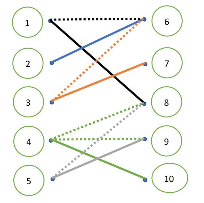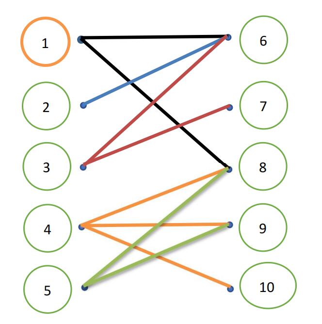 如图中的$1,2,…,10$就代表$10$个同学,其中$1,2,3,4,5$是外向的,$6,7,8,9,10$是内向的。如果一个外向的同学和一个内向的同学可以做同桌,就在他们两个之间连一条线,两个人不能做同桌,就不连。注意:因为班主任很严格,两个外向的同学或两个内向的同学都一定不能做同桌.