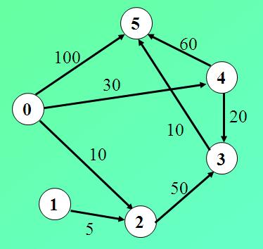 0: no 1: no 2: path:0 2 cost:10 3: path:0 4 3 cost:50 4: path:0 4 cost:30 5: path:0 4 3 5 cost:60