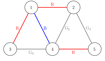 十字路口以及有效的道路的示意图如下所示,该方案最小化了染色道路的数量。请注意,每条道路上的颜色显示为 R(红色)、B(蓝色)或 G(灰色)。