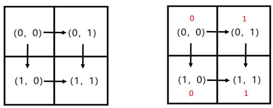 同时,将每条合法路径 P 经过的每个格子上填入的数字依次连接后,会得到一个长度为n + m − 1的 01 字符串,记为 s(P)。例如,如果我们在格子(0,0)和(1,0)上填入数字0,在格子(0,1)和(1,1)上填入数字 1(见上图红色数字)。那么对于路径p1,我们可以得到s(P1) = "011",对于路径p2,有s(P2) = "001"。