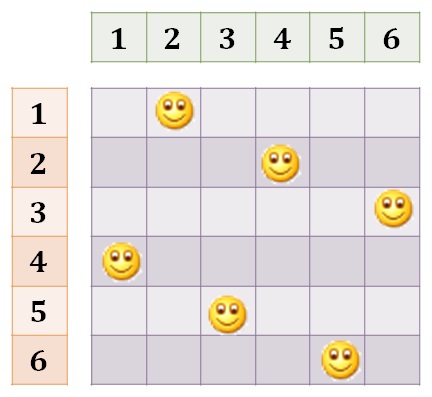 检查一个如下的6 x 6的跳棋棋盘,有六个棋子被放置在棋盘上,使得每行,每列,每条对角线(包括两条主对角线的所有对角线)上都至多有一个棋子,如下例,就是一种正确的布局。