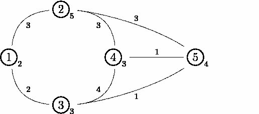 要从草地$1$走到草地$4$,可以从草地$1$走到草地$3$再走到草地$5$最后抵达草地$4$。如果这么走的话,需要的“边过路费”为$2+1+1=4$,需要的点过路费为$4$(草地$5$的点过路费最大),所以总的花费为$4+4=8$。