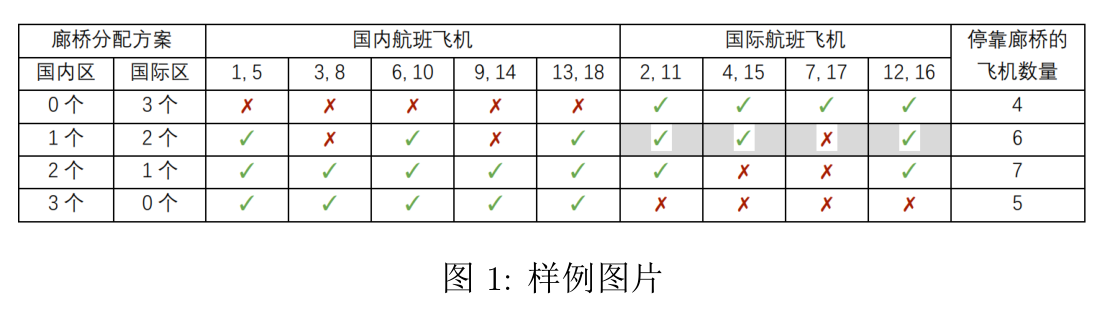 在图中,我们用抵达、离开时刻的数对来代表一架飞机,如(1, 5)表示时刻 1 抵达、时刻 5 离开的飞机;用√表示该飞机停靠在廊桥,用×表示该飞机停靠在远机位。