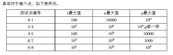 对于100%的数据,0 < t < 10^5,0< n < 10^9,0 < p < 10^9