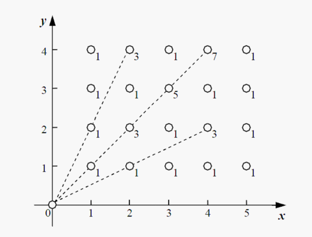 能量汇集机器在汇集的过程中有一定的能量损失。如果一棵植物与能量汇集机器连接而成的线段上有 $k$ 棵植物,则能 量的损失为 $2k + 1$。例如,当能量汇集机器收集坐标为 $(2, 4)$ 的植物时,由于连接线段上存在一棵植物 $(1, 2)$,会产生 $3$ 的能量损失。注意,如果一棵植物与能量汇集机器连接的线段上没有植物,则能量损失为 $1$。现在要计算总的能量损失。