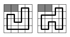必须要说的是,$Vologda$市的赛道将会相当简单。赛道将是一条穿过$N*M$矩形所有网格的单回路。每一段都和某个矩形的边平行,因此弯道都将是直角。在下图中,给出了$N=M=4$时的两种修筑方案(灰色格子意味着地鼠洞,粗黑线就是赛道)。在下图中没有其他的修建方案。