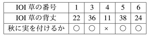 职业经营家庭菜园的JOI君每年在自家的田地中种植一种叫做IOI草的植物。IOI草的种子在冬天被播下,春天会发芽并生长至一个固定的高度。到了秋天,一些IOI草会结出美丽的果实,并被收获,其他的IOI草则会在冬天枯萎。