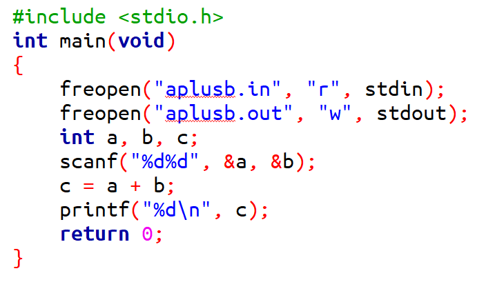 using namespace std; int main() { int a,b; freopen("aplusb.in","r",stdin); freopen("aplusb.out","w",stdout); cin>>a>>b; cout<<a+b; fclose(stdin); fclose(stdout); return 0; } 这个水体有点儿水
