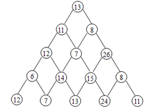 路径上结点中数字的和称为路径的值,如上面路径的值为13+11+7+14+7=52。同时,从图中可以看到除了上述路径外,还存在其他的路径,如: