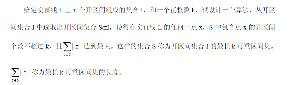 对于给定的开区间集合 $I$ 和正整数 $k$,计算开区间集合 $I$ 的最长 $k$ 可重区间集的长度。