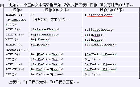 对输入数据我们有如下假定: MOVE操作不超过50 000个,INSERT、DELETE和ROTATE操作作的总个数不超过6 000,GET操作不超过20 000个,PREV和NEXT操作的总个数不超过20 000。 所有INSERT插入的字符数之和不超过2M(1M=1 024*1 024)。 DELETE操作、ROTATE操作和GET操作执行时光标后必然有足够的字符。MOVE、PREV、NEXT操作不会把光标移动到非法位置。 输入文件没有错误。