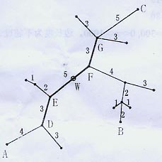 下面的图给出了树网的一个实例。图中,A-B与A-C是两条直径,长度均为20。点W是树网的中心,EF边的长度为5。如果指定s=11,则树网的核为路径DEFG(也可以取为路径DEF),偏心距为8。如果指定s=O(或s=1、s=2),则树网的核为结点F,偏心距为12。