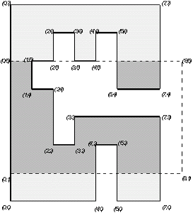 在文件的第一行有四个整数x1,y1,x2,y2 (0<=x1,y1,x2,y2<=10000),有一个空格隔开,(x1,y1)是窗户左上角的坐标,(x2,y2)是窗户右下角的坐标。 下一行有一个整数n(4<=n<=5000)表示多边形的顶点数。以下n行以逆时针的顺序给出了多边形的顶点坐标,也就是说当我们沿着给出的 多边形的边走时,多边形的内部在外部的左边。每一行包括两个整数x y(0<=x,y<=10000),有一个空格隔开,第(i+2)行表示多边形的第i个顶点。
