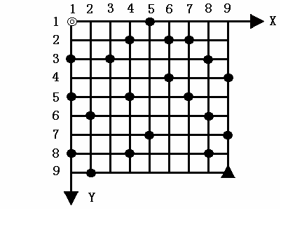 给定一个$N$*$N$ 的方形网格,设其左上角为起点◎,坐标为(1,1),$X$ 轴向右为正,$Y$轴向下为正,每个方格边长为1,如图所示。一辆汽车从起点◎出发驶向右下角终点▲,其坐标为($N$,$N$)。在若干个网格交叉点处,设置了油库,可供汽车在行驶途中加油。汽车在行驶过程中应遵守如下规则: