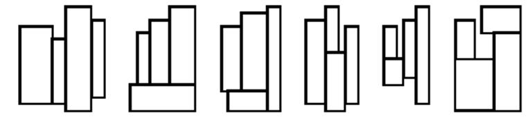 所有4个矩形块的边都与封闭矩形的边相平行,图1示出了铺放4个矩形块的6种方案。这6种方案是仅可能的基本铺放方案。因为其它方案能由基本方案通过旋转和镜像反射得到。