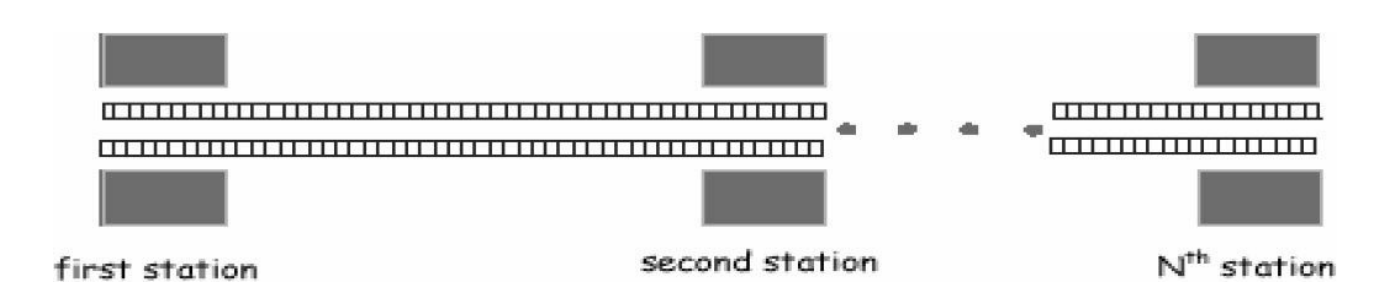 某城市的地铁是线性的,有 $n(2\le n\le 50)$ 个车站,从左到右编号为 $1~n$。有 $M_1$ 辆列车从第 $1$ 站开始往右开,还有 $M_2$ 辆列车从第 $n$ 站开始往左开。在时刻 $0$,Mario 从第 $1$ 站出发,目的是在时刻 $T(0\le T\le 200)$ 会见车站 $n$ 的一个间谍。在车站等车时容易被抓,所以她决定尽量躲在开动的火车上,让在车站等待的总时间尽量短。列车靠站停车时间忽略不计,且 Mario 身手敏捷,即使两辆方向不同的列车在同一时间靠站,Mario 也能完成换乘。(修正,数据范围内有时刻T超过200的存在,建议将数据T认为大小为500.————5801)