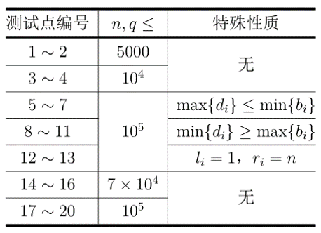 接下来 q 行,每行四个正整数li ,ri ,ci ,di 分别表示区间左端点,区间右端点,初始劳累度与初始有趣度。