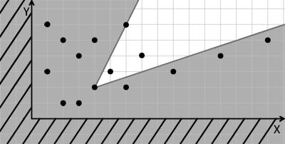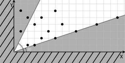如图所示,导弹一开始在(0,0)。它只能朝着一定的方向——即严格夹在图中两条射线间的方向(白色部分)前进。注意,它不能沿着这两条射线前进,当然也不能停在原地。