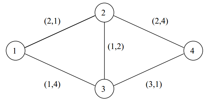 让我们考虑从城市1到城市4的四条不同路线,以及它们的通行费和耗时:1-2-4(费用4,耗时5),1-3-4(费用4,耗时5),1-2-3-4(费用6,耗时4),1-3-2-4(费用4,耗时10)。