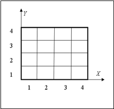 在定位系统中,世界被认为是一个$W \times W$的正方形区域,由$1 \times 1$的方格组成。每个方格都有一个坐标$(x,y),1\leq x,y\leq W$。坐标的编号从$1$开始。对于一个$4 \times 4$的正方形,就有$1\leq x\leq 4,1\leq y\leq 4$(如图):