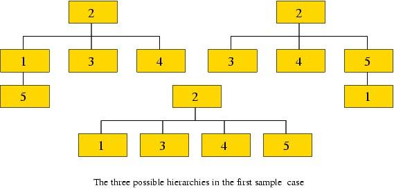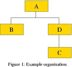 有一个部门是中央管理部(即图中的A部门),显然它必须在层次结构的顶端,但其余部门的相对重要性并未被确定,因此在上图中,C部门和D部门可以交换位置使得C部门掌管D部门。但是,让有些部门相互协作或许是不可能的,在这种情况下它们不能直接掌管对方。例如,如果上图中的A和D不能互相协作,那么图1的组织方式就是不合法的。