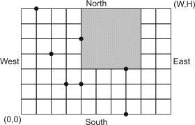 这个任务事实上相当简单,那个国王的园林有一个矩形的轮廓,并且在一块平整的土地上。除此以外,园林的边缘是正南北和东西方向的。与此同时,皇家板球比赛总是在一个正方形的场地上进行并且这个正方形的场地四边也都是正东西南北。建筑师已经有了一个平面直角坐标系并且对每一棵树的坐标的精确的测量。这个坐标系,当然了,也是正东西南北的。西北角坐标为(0,0)并且东南角的坐标为(W,H),同时W和H分别是园林的宽度和高度。