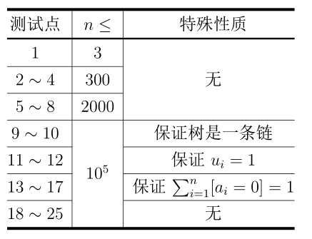 对于所有数据,$1\leq n\leq 10^5,1\leq u_i,v_i\leq n,a_i\in \{0,1,2\},1\leq w\leq 10^3$。