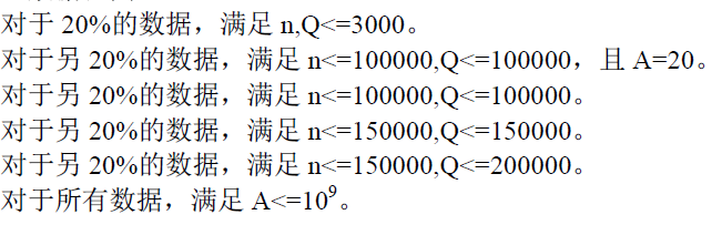 接下来Q行,每行三个用空格分开的数 u、 a、 b。对于这 Q行的每一行,用 a、b、A计算出 L和R,表示询问“在地方 u开店,面向妖怪的年龄区间为[L,R]的方案的方便值是多少”。对于其中第 1 行,L 和 R 的计算方法为:L=min(a%A,b%A), R=max(a%A,b%A)。对于第 2到第 Q行,假设前一行得到的方便值为 ans,那么当前行的 L 和 R 计算方法为: L=min((a+ans)%A,(b+ans)%A), R=max((a+ans)%A,(b+ans)%A)。
