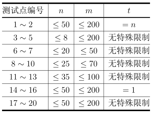 对于所有的数据,保证: $1 \leq C \leq 5$;$2 \leq n \leq 50$;$1 \leq t \leq n$;$1 \leq m \leq 200$;$1 \leq A_{i} \leq m$ 。