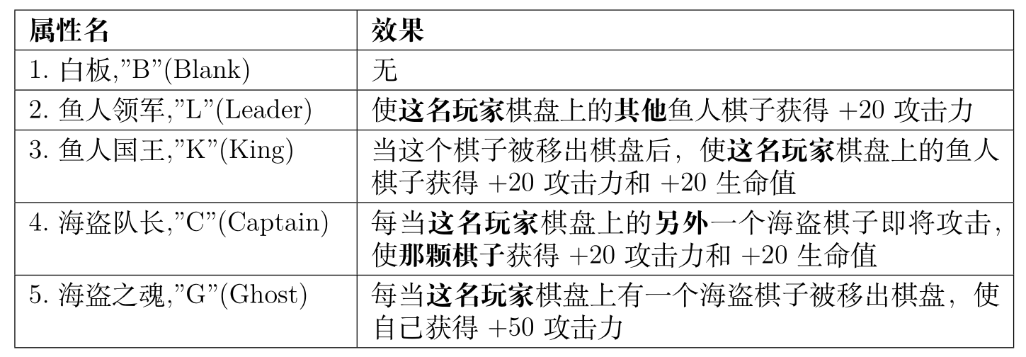 每个棋子有四个属性:攻击力,生命值,种族,特殊属性。攻击力和生命值为两个正整数,种族要么是鱼人 (”M”,Murloc),要么是海盗 (”P”,Pirate),特殊属性有以下 5 种: