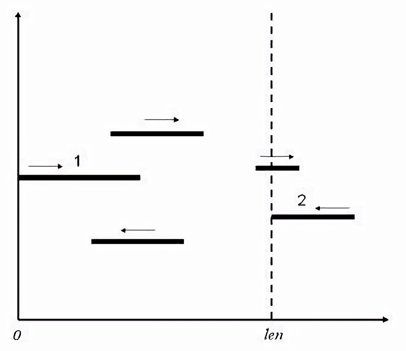 如上图,不妨设天空的左界为 $0$,右界为 $len$。