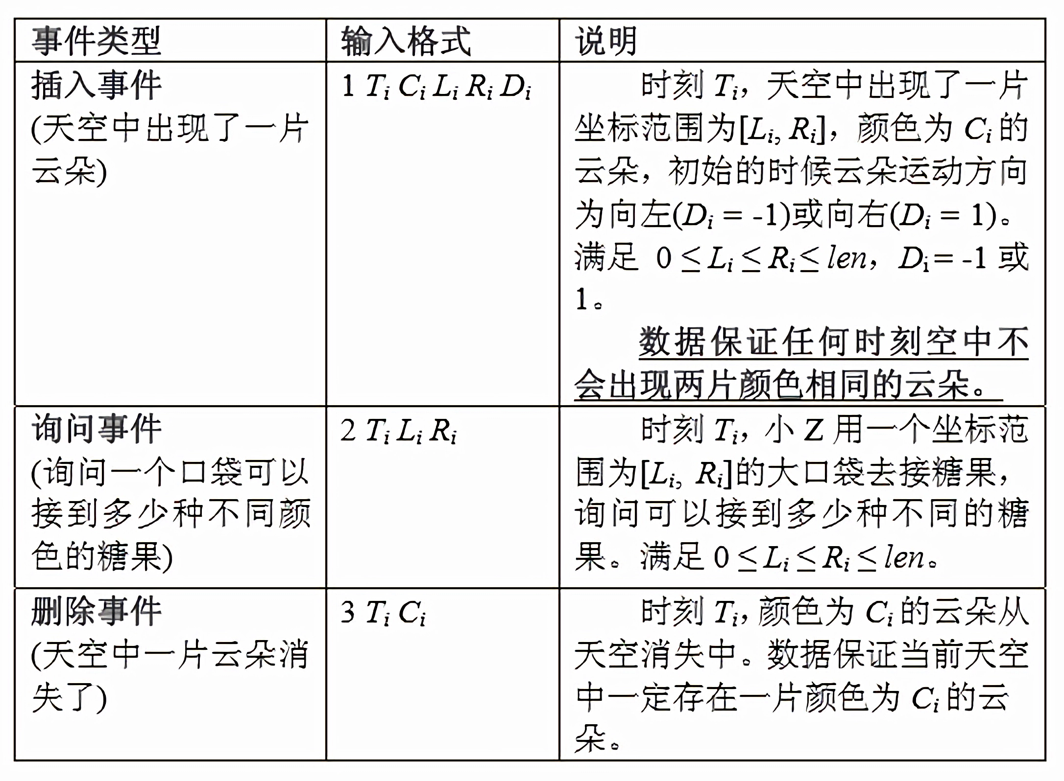 每行的第一个数 $k(k=1,2,3)$ 分别表示事件的类型,分别对应三种事件:插入事件,询问事件以及删除事件。