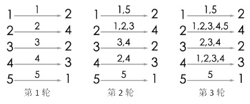 游戏的流程如图所示。当进行完第 3 轮游戏后, 4 号玩家会听到 2 号玩家告诉他自