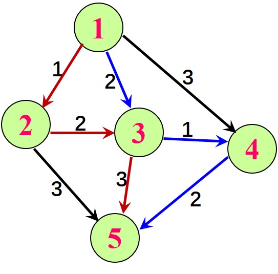 $1 \longrightarrow 5:1 \rightarrow 2 \rightarrow 3 \rightarrow 5,1 \rightarrow 3 \rightarrow 4 \rightarrow 5;2 条路,最短 5$