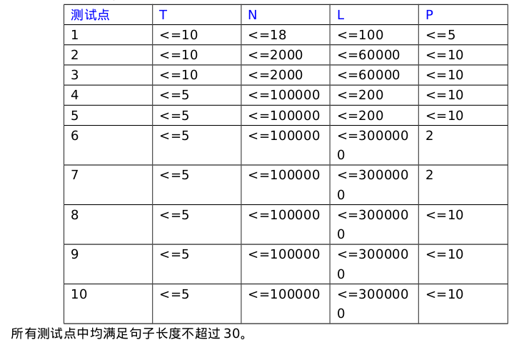 接下来为 $T$ 首诗,这里一首诗即为一组测试数据。每组测试数据中的第一行为三个由空格分隔的正整数 $N,L,P$,其中:$N$ 表示这首诗句子的数目,$L$ 表示这首诗的行标准长度,$P$ 的含义见问题描述。