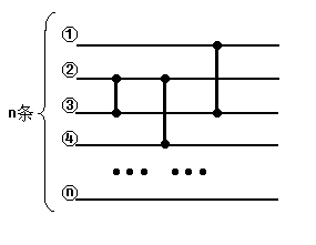 有 $n$ 条水平的导线,由上至下分别标号为 $1$ 至 $n$,导线与导线之间不相交。在任意两导线之间可以搭上“电桥”。每条导线的左端放置一数字,数字沿导线由左向右同步运行,当遇上一电桥时,比较电桥两端的两根导线上的数字,将其中较大的放到上面的导线上,而将较小的放到下面的导线上,然后继续运行,保证同一时刻最多只有一个电桥。(如图)