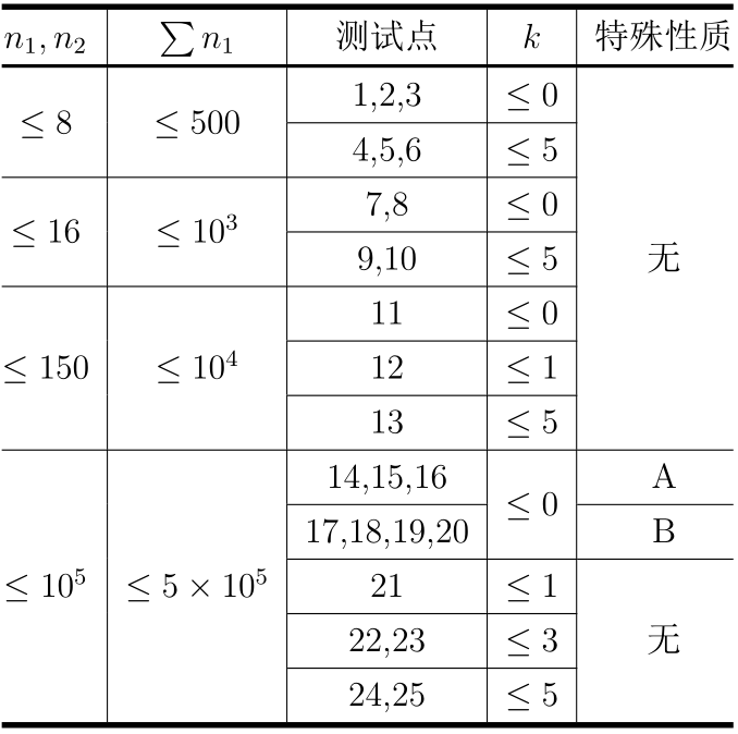 对于所有测试数据,满足 $1 \leq T \leq 500$,$1 \le n_2 \leq n_1 \le {10}^5$,$\sum n_1 \leq 5 \times {10}^5$,$0 \leq k \leq 5$。各测试点的附加限制如下表所示: