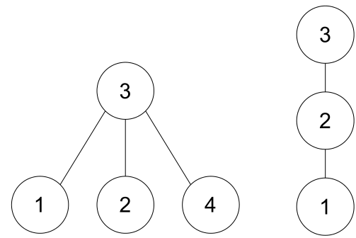 · 特殊性质 B:保证有根树 $G$ 每个节点要么是叶节点,要么有恰好 $2$ 个儿子结点,同时保证 $G$ 的每一个叶节点深度均相同;另一种等价的表述是有根树 $G$ 构成一棵完全二叉树,且根节点为完全二叉树的根节点。
