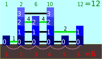 考虑如下例子。有6栋大楼,从左到右的高度分别是1,4,3,4,1,2,且h=2。Alice开始时计数器为1,并且将计数器加了五次1,得到的结果是6.Bob开始时计数器为1,然后他依次加上1,4,4,2,最终得到12.注意,Bob出于恐高忽略掉了最高的溜索。