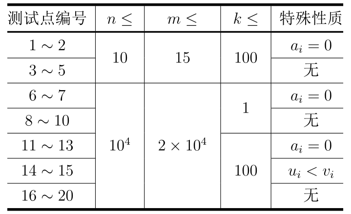 对于所有测试数据有:$2 \leq n \leq 10 ^ 4$,$1 \leq m \leq 2 \times 10 ^ 4$,$1 \leq k \leq 100$,$1 \leq u _ i, v _ i \leq n$,$0 \leq a _ i \leq 10 ^ 6$。