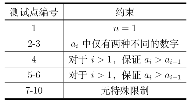 对于所有数据,$1\leq n\leq 100,0\leq a_i\leq 10^9$。每个测试点的具体限制见下表: