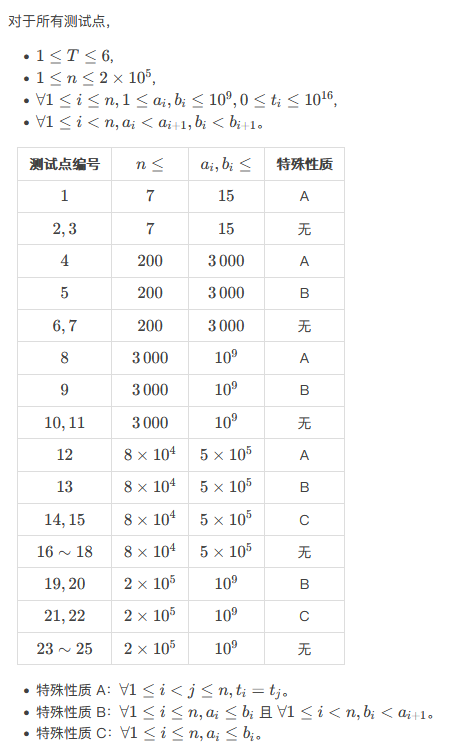 在一条无穷长的数轴上摆放着 $n$ 个箱子。第 $i$ ($1 \leq i \leq n$) 个箱子在时刻 0 位于数轴 $a_i$ 处,而你希望在时刻 $t_i$ 以及之后的所有时刻,这个箱子处在数轴的 $b_i$ 处。保证序列 $[a_1, \ldots, a_n]$ 和 $[b_1, \ldots, b_n]$ 单调递增。