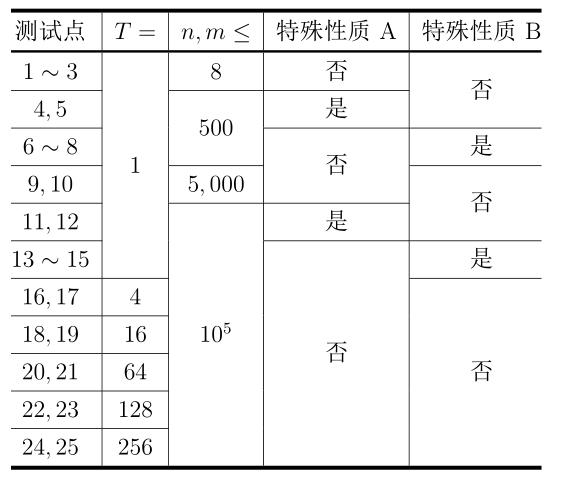 对于所有测试数据,保证:$2 \leq n, m \leq 10^5$,$0 \leq a_i, X_j < 2^{31}$,$1 \leq c_i \leq n$,$1 \leq T \leq 256$。