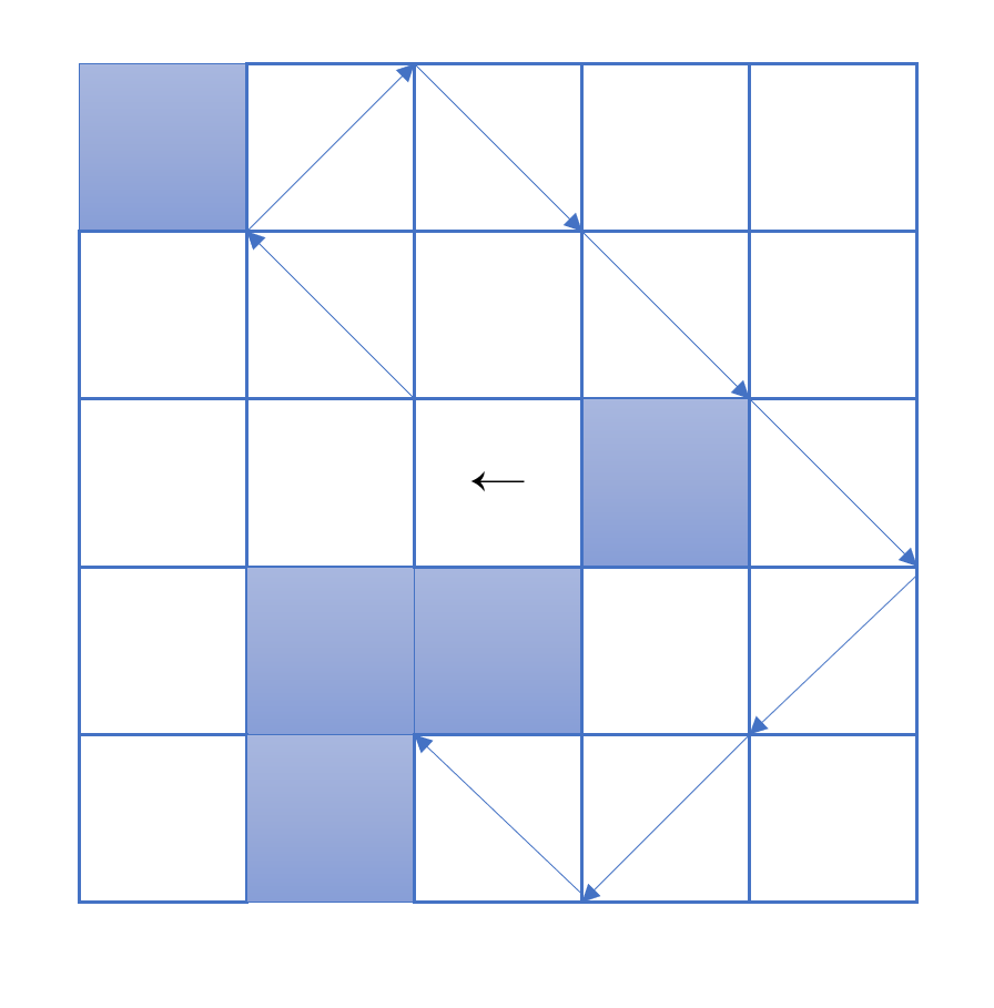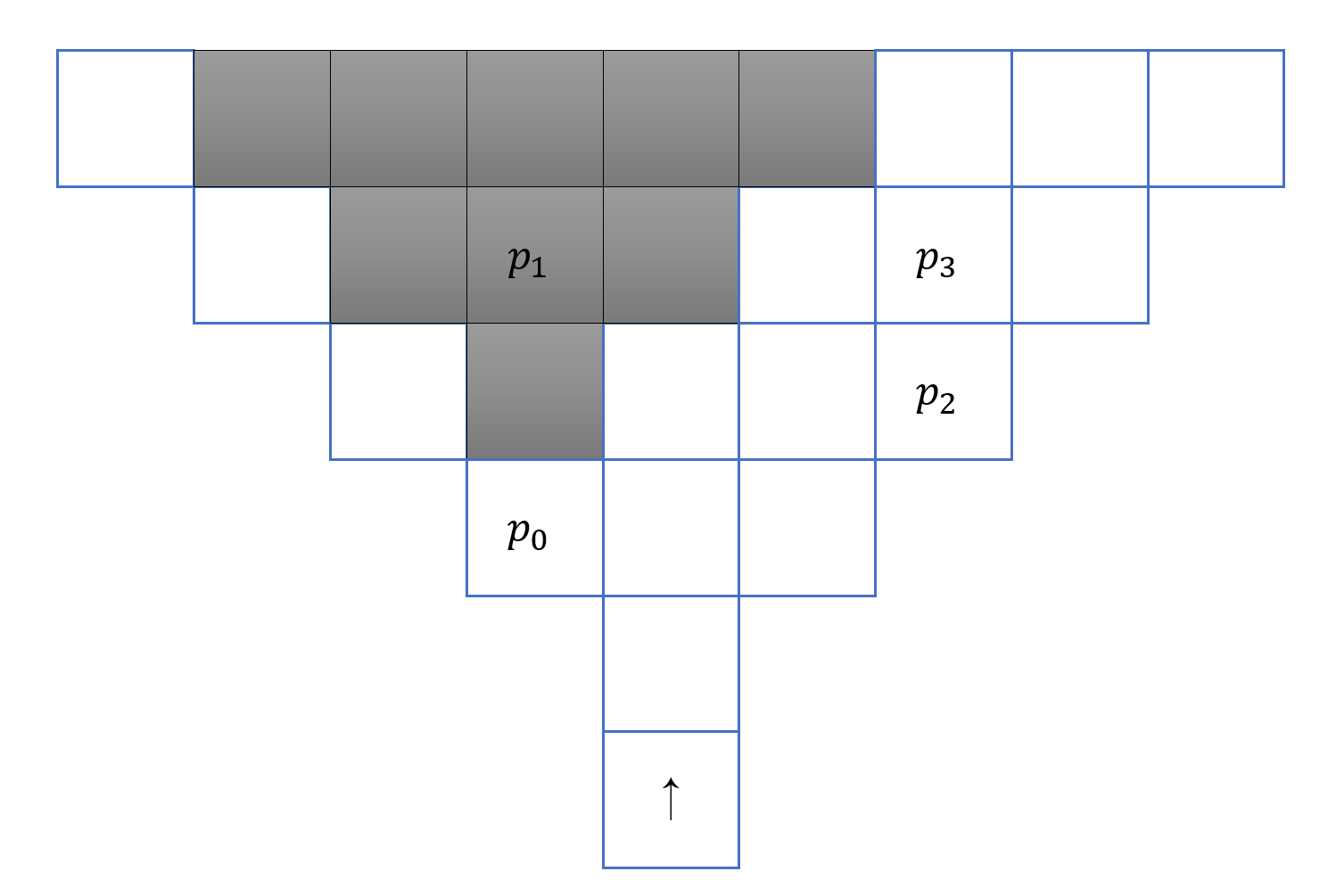 从上图我们可以看出,在图的最下方有正在释放技能的棋子,其技能朝向为上,所以其技能方向也为上。则上方的所有区域则为其技能所影响到的扇形区域,该扇形区域大小为 $5$,即 $v=5$。注意到棋盘上某些位置会有障碍物,障碍物的存在会影响到该技能的影响范围。如果一个障碍物存在于技能范围之内,那么以障碍物开始的处于技能范围内的扇形区域也都不会受到技能的影响。如上图可见,所有黑色格子的最下方格子即为障碍物的位置,所有黑色格子即为受到障碍物影响所不能被技能效果影响的格子。
