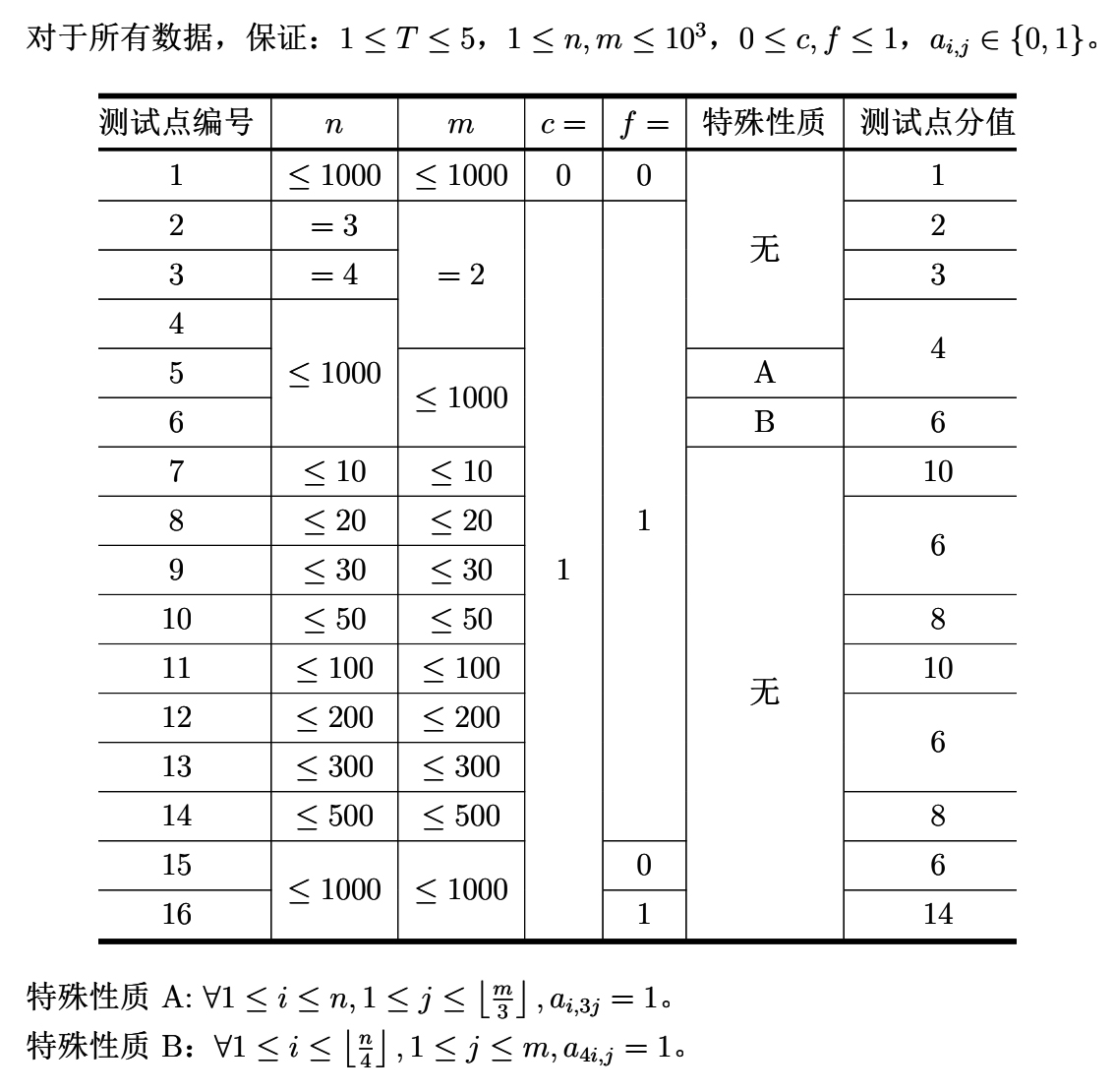 现在小 $C$ 想知道,给定 $n, m$ 以及表示每个位置是否为土坑的值 ${a_i,j}$, $\rm C‐形$ 和 $\rm F‐形$ 种花方案分别有多少种可能?由于答案可能非常之大,你只需要输出其对 $998244353$ 取模的结果即可,具体输出结果请看输出格式部分。